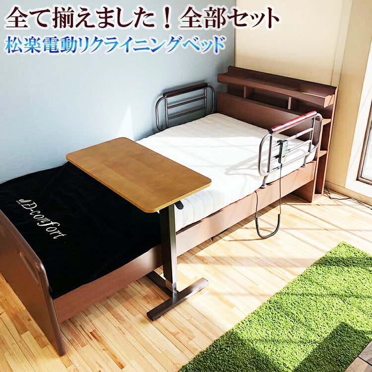 (組立設置無料) 電動ベッド 2モーター バックスライド 松楽 全部セット 【 電動リクライニングベッド 高さ4段階 コンセント LED 昇降テーブル マットレス付 手すり付き 設置無料 モダン 宮付き 宮付 ベッド シングルベッド 昇降式テーブル 】